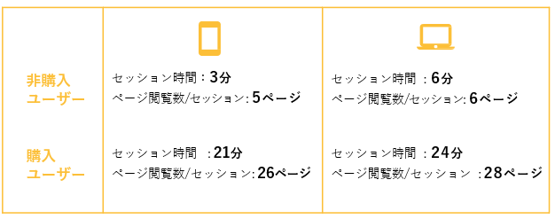 購入ユーザーはデスクトップとモバイルで行動に大差は見られませんが、非購入ユーザーはモバイルの方が圧倒的に早く離脱する傾向にあり、デスクトップの半分の時間で離脱しています。
