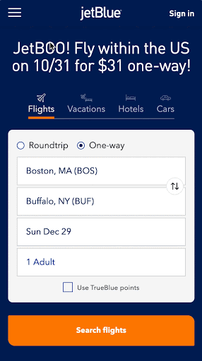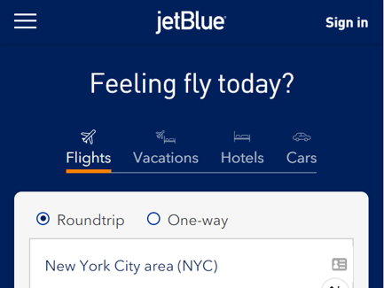 下記は格安航空会社JetBlueのモバイルサイトTOPページです。