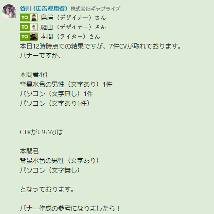 きっかけは、初回ミーティングで「ライターとデザイナーの3人でバナーを作りそれぞれのバナー成績で勝負したらおもしろいのでは?」との提案からです。