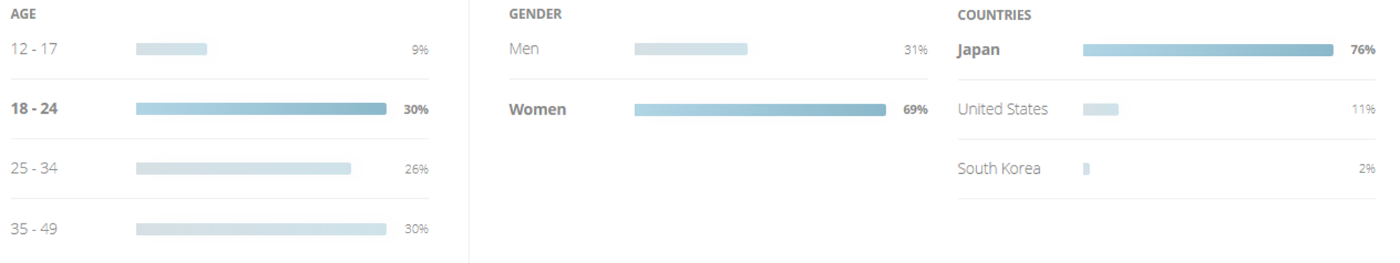 世界の美味しいグルメさんの投稿にエンゲージしている人の属性を見ると18~49歳までと、年齢層は幅広く殆どは日本人の女性です。