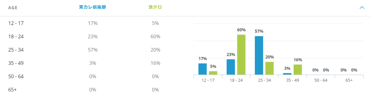 下図は#東カレ倶楽部と#食テロの比較ですが、#東カレ倶楽部の方が若年層でよく使われ、#食テロは12-49歳までの広い年齢層、特に18-24歳の層で多く利用されているハッシュタグだという事が分かります。
