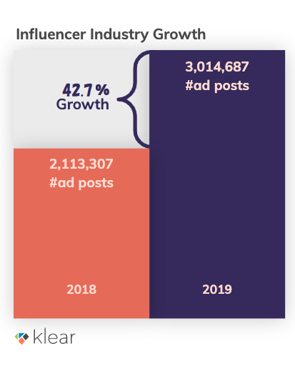 Klear社の調査では、2019年はInstagramでインフルエンサーの広告投稿数が42.7%増加したことがわかりました。