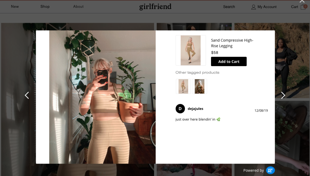 キュレーションされたUGCギャラリーは、訪問者を刺激し注目商品をカートに簡単に追加できます。
