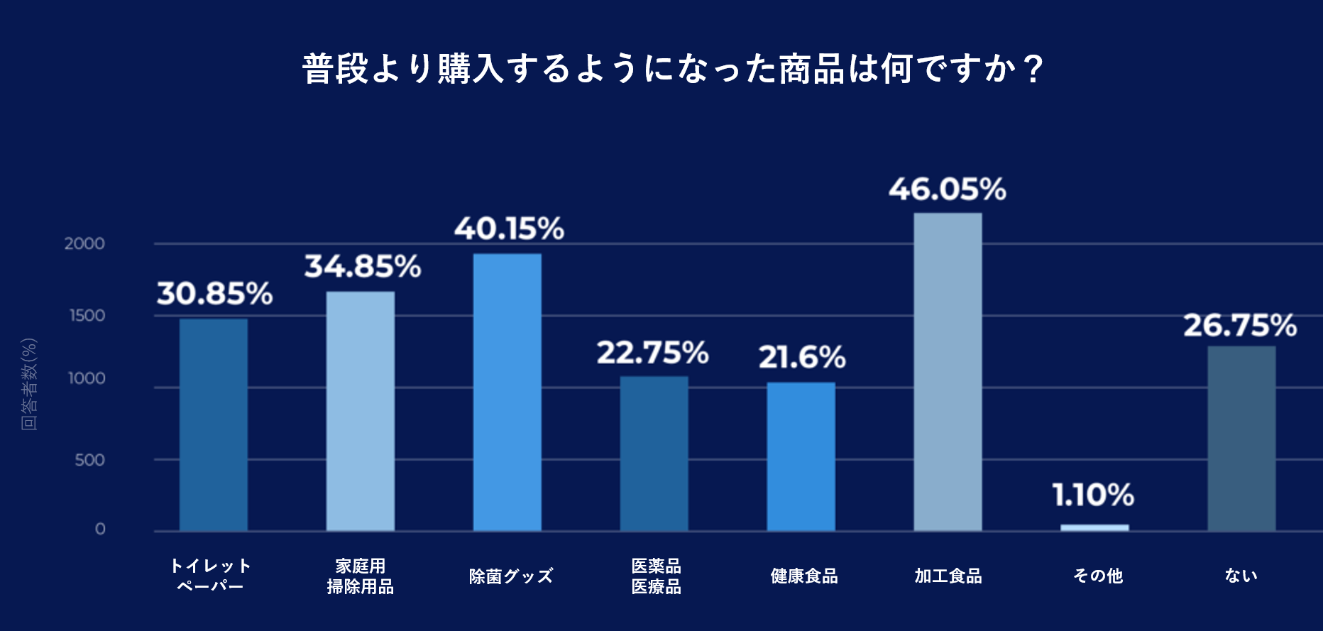 消費者はまた、家庭用掃除用品(34.95%)やトイレットペーパー(30.85%)の購入頻度が上がりました。水やキャンピング用品、冷凍食品、ビール、酒などの回答も。