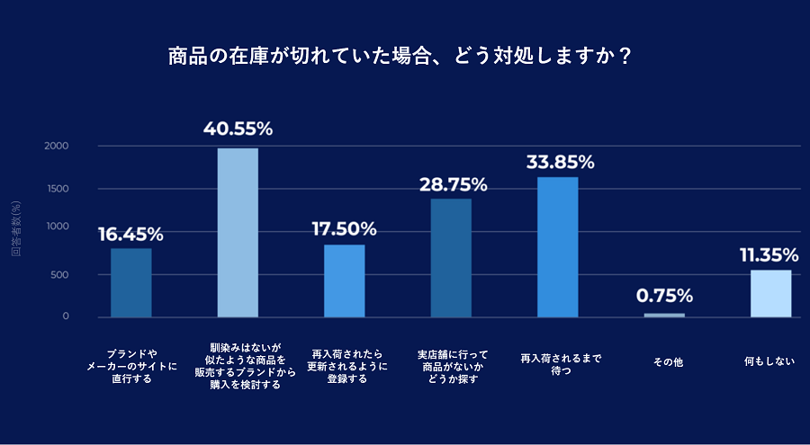 もし、商品が手に入らない場合、40.55%の消費者は馴染みはないが似たような商品を販売するブランドからの購入を検討。また、33.85%は再入荷されるまで待つ一方で、28.75%は実店舗に行って商品がないかどうか探します。17.50%は再入荷を知らせるよう登録をしておくと回答しました。